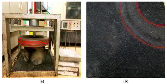 The accelerated wear tester [6] developed by Chang’an University (Figure 8a) was used to simulate the vehicle abrasion during the fog seal use. The instrument contained four 45 mm-wide polyurethane tires. Figure 8b shows the tire trajectory after wear. The rotation frequency was 5000 rpm/h. The calculated linear speed was 84.78 km/h, which was close to the design speed of high-grade highways. The test adjusted the bottom tire load by loading the disk. The vertical load was set to 1.4 MPa. The quality loss rate of the specimen after 100,000 instances of abrasion was used to evaluate the abrasion resistance of the anti-slip fog sealing layer. Equation (2) shows the mass loss rate calculation. The smaller the mass loss rate, the better the adhesion durability of the anti-slide fog sealing layer.