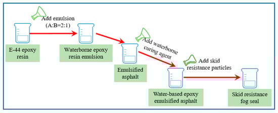 Figure 10. Preparation process of skid resistance fog seal. - Skid resistance fog seal development and performance verification process: this research focuses on the development and application of a skid resistance fog seal. First, a skid resistance fog seal with water-based epoxy emulsified asphalt and anti-slip particles is preferable. Second, the performance of the fog seal from the aspects of bond performance, permeability, and aging resistance was verified. Finally, the application research of the skid resistance fog seal was conducted from the two aspects of road performance and construction technology. Figure 11 illustrates the relevant flow chart. The preparation process of the skid resistance fog seal are as follows: (1) Add emulsion (Emulsion A:Emulsion B = 2:1) into E-44 epoxy resin to get waterborne epoxy resin emulsion. (2) Add waterborne curing agent waterborne epoxy resin emulsion and into emulsified asphalt to get water-based epoxy emulsified asphalt. (3) Add skid resistance particles into water-based epoxy emulsified asphalt to get skid resistance fog seal.