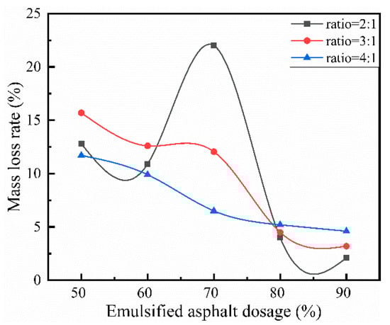 Figure 14 shows the mass loss rate of the epoxy emulsified asphalt-cured products with different ratios after 48 h of UV aging.