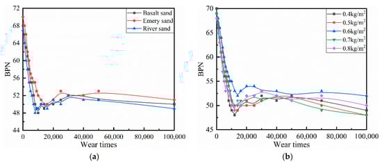 Figure 16a depicts that among the three types of skid resistance particles, emery provided the highest initial BPN (skid resistance) for the asphalt pavement. Its BPN curve was above the other two curves during the wear process, indicating that the BPN was higher than the other two. The BPN of the three specimens decreased by 32.5%, 32.8%, and 32.4%, respectively, after 100,000 instances of abrasion. The reduction ratio of the emery specimens was smaller with better skid resistance because of the inconsistent edges and corners of the skid resistance particles. The emery sand mostly had a cubic shape, with sharp edges and corners, a rough surface, and a uniform particle size distribution. In contrast, basalt and natural river sands were mostly spherical or ellipsoid in shape, with a smooth surface and a limited friction.