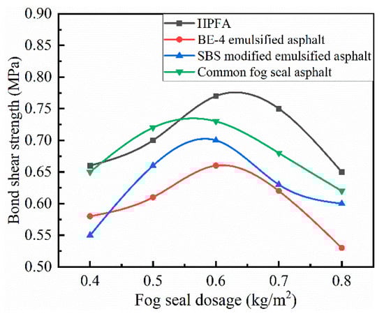 Figure 17 illustrates the results of the shear strength of the fog seal with different dosages.