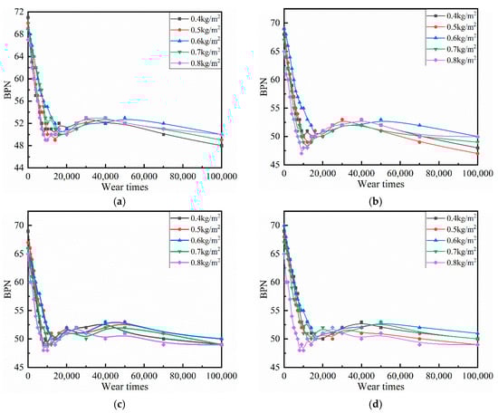 Figure 16b illustrates that when the amount of emery sand was 0.6 kg/m2, the BPN curve of the skid resistance seal specimen was located above, and the skid resistance was better. The surface roughness of the test piece can be significantly improved when the dosage is small; however, it can easily be worn away during the wear process because of the small mutual intercalation. The BPN also rapidly decreases. The surface structure was gradually filled when the dosage was close to 0.6 kg/m2. At this time, the fog seal specimen showed better skid resistance and wear resistance performance. When the content was large, the skid resistance fog seal had floating sand, and no fog sealant on the surface provided sufficient adhesion. Therefore, it can easily be abraded to reduce the skid resistance performance.