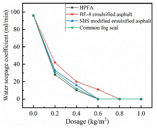 The reduction ratio of the water permeability coefficient was more than 50% when different amounts of fog sealant were applied on the rutting board. This result indicates that the fog seal layer material can effectively improve the road surface anti-seepage ability. The fog seal layer commonly used asphalt, SBS-modified emulsified asphalt, and HPFA when the dosage was close to 0.6 kg/m2. The rut board can be completely impermeable to water. Meanwhile, the BE-4 type emulsified asphalt can be completely sealed when the dosage was close to 0.8 kg/m2. The critical dosage when the fog sealant was completely sealed with water was taken as the optimal amount of fog sealant for the road surface, i.e., the minimum amount when the road surface is completely impervious to water.