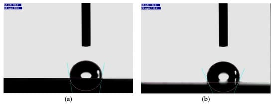 Contact angle measurement image: (a) BE-4 modified emulsified asphalt; (b) HPFA.