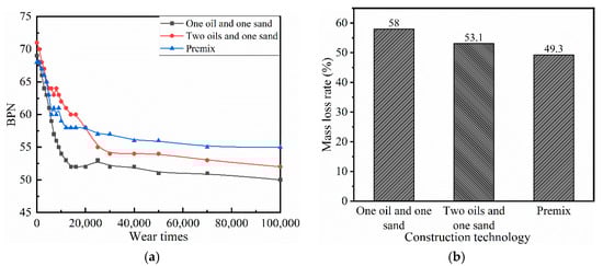 Figure 22a depicts that the initial BPN of the premix process specimen was the smallest, while that of the “one oil and one sand” process specimen was the largest. This result can be attributed to the premix process fully covering the skid resistance particles with the mist-sealing binder, such that the anti-slip particles lost angularity, and the surface roughness was reduced. After 100,000 instances of abrasion, the BPN of the three kinds of test pieces decreased by 25.0%, 20.0%, and 13.2%, respectively. The BPN of the test pieces formed by the premix process had the smallest reduction and a better wear resistance performance. This result is attributed to the premix process being able to fully cover the fog seal binder and skid resistance particles, which increased the adhesion area of the skid resistance particles and the fog seal binder and further improved the adhesion, making the skid resistance particles not easily worn away. Better anti-slip performance and wear resistance were observed.