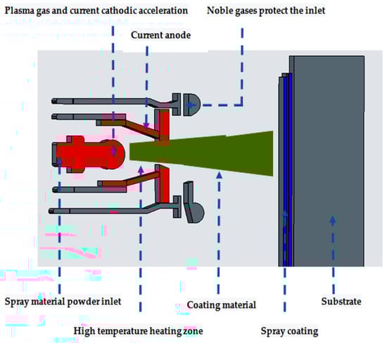 In recent years, supersonic plasma spraying (SPS) is a new multi-purpose precision spraying method developed after the success of flame spraying. It is also a method used in material surface strengthening and surface modification [1,2]. SPS has a lot of rigidity, with the jet being given priority with laminar flow, surrounding air cannot easily enter and less impurities. Also, the ion impact kinetic energy on the surface of the substrate is bigger, which reduces the incomplete overlap between the ions, makes preparation of coating have A higher hardness and bonding strength, low porosity, crack, less coating quality, and good waiting times for A characteristic. These features for the preparation of ceramic powder coating have great advantages, and the technology is stable. With spraying material variety, the part deformation is small, do not change the overall performance of the parts, have received extensive attention from researchers, and is an ultra-high temperature, high speed ion spray, resulting in a dense coating with low porosity [3,4,5,6]. The spraying material is not easy to oxidize and adds wear resistance, corrosion resistance, high temperature oxidation resistance, and other properties to the substrate surface material [7,8]. This important technology has been widely in the aerospace, electronics, and automotive industries to save energy, improve product quality, extend product life, improve the efficiency of materials, and improve reusability [9]. Figure 1 Schematic diagram of SPS.