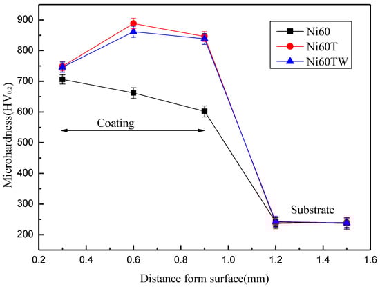 The micro-hardness distribution of the coating along the direction of the substrate was tested. As shown in Figure 5, the hardness of Ni60 coating was the lowest, while the hardness of Ni60T was the highest. The hardness of Ni60T and Ni60TW were higher than that of 45# steel (HV695). The spraying process affects the microhardness of the coatings. The deposit after melting or softening of the particles to deposit first pancake grain hit the compaction effect, it appeared to maintain a different degree of strain hardening effect, and was made near the interface of coating organization than near the particle deformation spread out on the surface of the coating. This is better as it is dense, with less holes, and close to the hardness of 45# steel substrate is reduced, this is because at the start of the spray, it is not even the micro cracks, pores, etc. caused by the defects. The decrease of hardness value and the big fluctuation are caused by being closer to the surface of the coating, the loose and uneven structure, and the increase of coating defects. The non-uniformity of the tissues in the coating resulted in the differences of surface hardness due to the pores. Adding nano TiO2 particles caused dispersion strengthening in the Ni60 mixed powder, leading to the maximum hardness value.