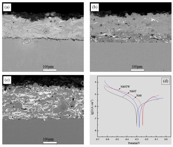 Three samples were left in NaCl solution with a concentration of 3.5 wt.% for 120 h. Figure 6 presents the coating section microscopic scanning images. In Figure 6a, Ni60 coating and substrate interface cracking appeared due to salt corrosion. In Figure 6b,c, Ni60T and Ni60TW show no obvious corrosion products after the NaCl bath. Hybride coatings provide a protective effect that prevents the corrosion reaction and improves the corrosion resistance of coating. They can also cause the coating surface to have a smooth and uniform corrosion, or corrosion products for selective corrosion [2]. Figure 6d shows the electrochemical corrosion curve of the three coatings in the corrosive medium NaCl solution. According to the curve, the self-corrosion potential moves forward to a certain extent, the corrosion current density decreases significantly, and the corrosion resistance of the coatings increases. The Ni60T coating has the best corrosion resistance.
