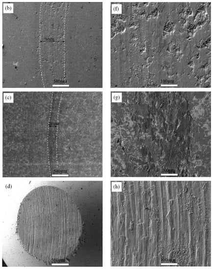Figure 8 shows the friction and wear morphologies of the three coatings under 60 N loading. Figure 8a displays the Ni60 wear surface morphologies. Figure 8e is magnification of the Ni60 wear area. There are abrasive chips and pits on the surface, mainly with abrasive wear mechanism. Figure 8b is the Ni60T coating wear surface topography. From the diagram, it can be seen that the surface wear trace area increases up to 760 μm. This is due to the hardness of the Ni60T coating surface, which leads to more wear and tear on the surface of the friction pair. Figure 8g is a larger view of the wear area of Ni60T. The surface is smooth, and there is no pit-like morphology. The primary feature is an adhesive wear mechanism. Figure 8c is the surface of the wear of the Ni60TW coating. The wear trace is 240 μm. The wear trace appeared to quickly reduce; this is because the coating surface hardness is low, and thus, the friction pair of the surface caused the grinding crack depth increase. See from Figure 8f, on the surface there exhibits certain furrow pits of abrasive grain and morphology, characterized by abrasive wear and fatigue wear mechanism. Figure 8d shows the surface wear morphology of the Ni60T friction pair ball (GCr15), with the edge of the worn surface falling off, and the obvious furrow morphology in Figure 8h, which also reflects the reason why the coating hardness of Ni60T surface is larger and the friction coefficient is smaller.