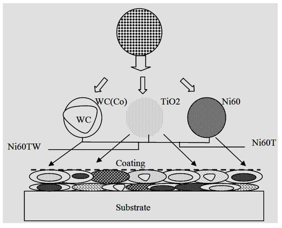 NiCrBSi (Ni60) is an allow powder with a low melting point, good flow performance, high hardness, and good organizational performance, often used for the preparation of heat resistant, corrosion resistant, oxidation resistant alloy coatings [10]. Ni60 coating exhibits excellent wear resistance, oxidation resistance, low cost, and good fracture toughness [11]. Due to its favorable qualities, it has the attention of researchers, but Ni60 compared with ceramic coating, problems such as low hardness and easy deformation cannot meet the requirements of wear resistance [12]. WC and Co metallic ceramic coating are used in the metal surface in order to improve the surface hardness, wear resistance, and corrosion resistance; however, if the proportion of the metal to ceramic in the material is not correct, the surface coating may be too brittle [13,14,15]. In this paper, the supersonic plasma spraying technology was used to create materials with Ni60 powder, nano TiO2 powder, and Co cladding WC cermet coating material preparation Ni coating material. The preparation technology and properties of the three kinds of coatings were studied.
