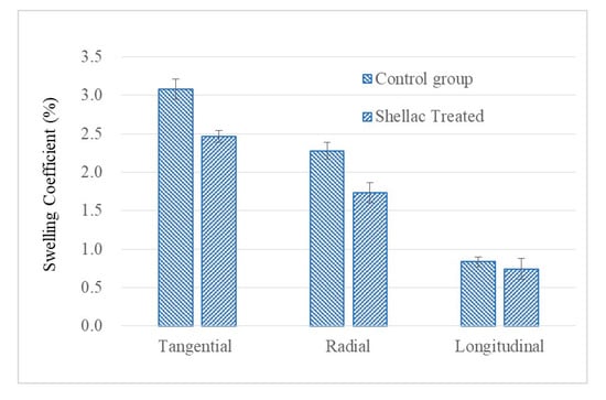 Swelling coefficients in different directions for the control and shellac-treated groups.
