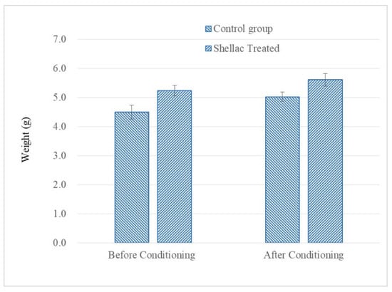Moisture content is an important factor affecting wood stability when it is below the threshold of fiber saturation. In order to further elucidate the effect of shellac solution impregnation on wood dimensional stability, the hydrophilicity of wood was evaluated via the measurement of MA. Figure 2 shows the specimen weight before and after conditioning inside one climate chamber, with the temperature set as 20 °C and humidity as 65%. The specimen weights before and after conditioning were 5.239 g and 5.618 g, respectively, and the MA was approximately 7.23%. Weight in control group before and after conditioning were 4.636 g and 5.178 g, respectively, and MA was approximately 11.69%. In comparison with the control group, MA in treated group had reduced by 38.15%. In consequence, shellac treatment significantly lowered wood MA performance and thus promoted wood dimensional stability.