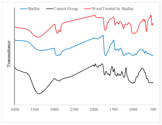 Wood dimensional stability is related to its hydrophilic chemical composition, which generally contains hydroxyl groups and other chemical components. By reducing these components, the dimensional stability of wood is improved [41,42]. FTIR-ATR spectrometry has been widely employed to reveal chemical changes associated with various treatments. Infrared spectra are sensitive indicators of chemical changes, as demonstrated by previous research on wood treatments [43,44,45,46]. Figure 3 presents the FTIR spectra for shellac, shellac treatment specimens, as well as the control group. In comparison with the control group, the specimen chemical structure after shellac treatment in the treated group was adjusted, with spectra remaining constant. The weakening of band intensity at ~3400 cm−1, matched with the −OH stretching, showed that the shellac treatment reduced the number of hydroxyls in wood but augmented wood dimensional stability [47,48]. Furthermore, band intensity at 1384 and 2900 cm−1 was matched with −CH stretching, while bands at 1709 and 1631 cm−1 were allocated to C=O and aromatic carbon skeleton stretching vibration, separately. No changes occurred in the other chemical groups after shellac treatment. Though shellac treatment changed the chemical groups of wood to some extent, the overall structure of the wood remained unchanged.