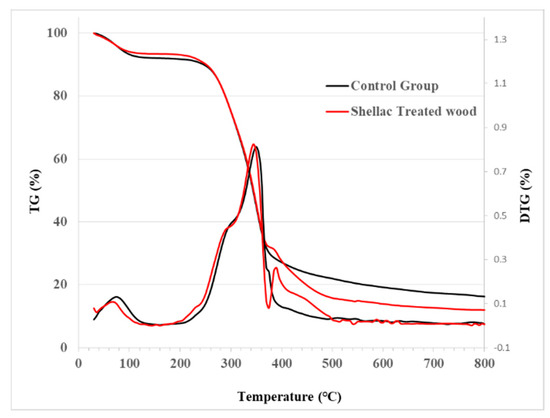 In order to evaluate the thermal characteristics of wood before and after shellac solution impregnation treatment, the thermogravimetric (TG) and derivative thermogravimetric (DTG) curves of the specimens in treated group and control group were constructed, respectively, as shown in Figure 4. The first region expressed as “a” in the TG curve is referred to as the depolymerization and dehydration stage, which implies the presence of slight weight loss (approximately 6–8 wt%) in 30–120 °C for entire samples. During the stage, wood specimens may take in heat, leading to evaporation and loss of low-weight molecules in specimens. Additionally, no evidence saw an apparent degradation of wood components [44,45,46]. In regard to region “b”, with temperature varying in the range of 120 to 230 °C, wood components such as hemicellulose were possibly degraded [2,24,49,50], but those with sophisticated structures were very likely to have bond fragmentation. Most quality loss can be seen in region “c”, with temperature varying in the range of 230–490 °C. For region “c”, overall structural components, accounting for approximately 80% of the gross mass in specimens experienced thermal degradation. Additionally, in region “c”, specimens after shellac treatment had a different reaction, and two peaks occurred at 350 and 390 °C, respectively. On the contrary, control specimens in the more common DTG curve saw a sharp peak at 355 °C due to cellulose decomposition [51]. In region “d”, the gross quality loss of specimens was slow. In this stage, residuals in the treated group dropped by 12.01% in comparison with that in the control group (16.30 wt%). Reductions in residuals may be related to the degradation of most shellac, but several wood constituents were nondegradable.