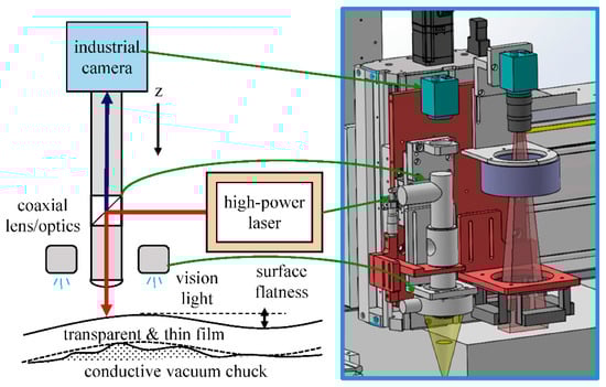 The standard for PEs, IEC 62899-201, presents physical conditions in detail, such as the thickness, defects, surface flatness, and bending radius []. In laser ablation for a large area, the quality of the beam focus is dependent on the surface flatness, thickness, and bending radius of the film. The film is usually fixed on a conductive vacuum chuck (CVC) to avoid film fluctuations during laser ablation; however, the flexible and thin film then bends, according to the surface shape of the CVC. The focus depth of a lens for laser ablation is narrow; thus, the chucking bending causes defocusing of the high-power laser. The surface flatness is insignificant in a case of local ablation; however, this is not the case for the larger-area ablations. Thus, the surface flatness is measured using a non-contact method, and the defocus is compensated according to the surface flatness for the large-area ablation. Measurement methods are also defined in the standard, and most studies have discussed thickness measurements of printed devices. The non-contact measurement of the thickness is basically related to the measurement of the surface flatness, as both are obtained using the relative distance between a sensor and film. Seong measured the thicknesses of printed patterns using capacitive and eddy current sensors, in consideration of film fluctuations. The measured values were monitored using a gravure printing system []. The thickness of a transparent and thin film for a printed device can also be measured using a laser gap sensor. A commercial laser sensor detects a pair of optical reflection peaks from the front and bottom sides of the film. Choi proposed a laser confocal reflection method for thickness measurements of large areas []. His method was applied to a dual-layer hard coating on a PET film. Bornemann presented thickness measurements for large-area and multi-layer printed devices using RGB scanning images and color contrast []. The method was tested using an organic semiconductor and showed sub-100 nm accuracy. However, studies on the surface flatness values of transparent and thin films in PEs are relatively rare compared to the above-noted thickness measurements.