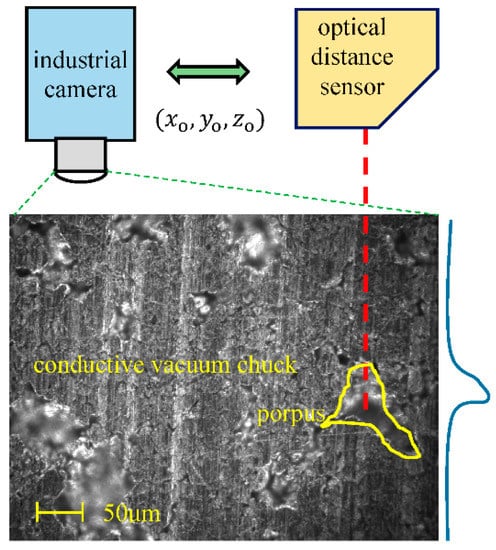 However, in this process, the film is always bent according to the chuck surface after chucking, owing to its flexibility and thinness [,]. The bending causes variations in the relative distance and defocusing of the laser ablation. The variation is insignificant in local processing because of the smoothness and continuity of the film surface, as shown in Figure 1. Nevertheless, it becomes crucial in large-area processing; thus, the variations and corresponding surface flatness values should be compensated at the ablation positions. The CVC is a porous metal plate made by sintering aluminum foam [,]. A vacuum supplied from a pump passes through micro-holes in the metal plate and adheres to the film. As shown in Figure 2, the surface of the metal plate is rough and uneven at the micro-scale owing to its porosity, but a contour of the surface flatness can be achieved at the macro-scale. The target surface is a smooth face and occupies a larger area than that of the porosity. When measuring surface flatness, a laser spot can be placed on the porosity; thus, an area method, such as autofocus (AF) using a camera, is advantageous.
