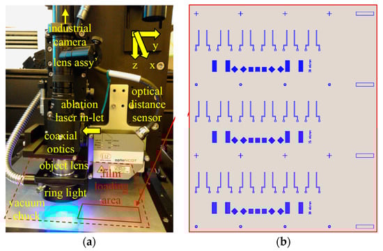 The laser ablation system is composed of a linear stage, ablation head, high-power laser source, light source, CVC, controller and ODS. The linear stage transfers the ablation head above the CVC based on Cartesian coordinates. In this study, the xy axes comprised the gantry structure, and were driven using high-speed linear motors. The z-axis was constructed using a high-accuracy ball screw and was installed on the gantry. The ablation head was attached on the z-axis, and the ODS was equipped near the ablation head, as shown in Figure 3a.