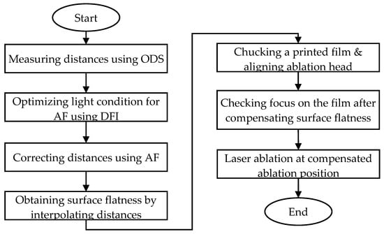In this study, a method for measuring the surface flatness of a transparent and thin film was proposed, based on the AF for the laser ablation of PEs. The defocusing of laser ablation owing to the chucking bending of the flexible and thin film can be reduced by the surface flatness. The surface flatness of the film was estimated from that of the CVC based on a non-contact and optical method considering the transparency, thinness, and printed patterns of the film. The surface flatness of the CVC was measured using an optical distance sensor according to the variable grid density. The proper grid density of the measurement points was determined by considering the porosity of the CVC and coarseness of the contour maps. AF was performed to correct the measured position by the ODS, as the errors caused by the ODS were caused by localities. An interpolated position was obtained from the surface flatness as corrected by the AF. The results showed that 92.2% of the test points were usable for laser ablation and most of defocus was caused by the vacuum leak at the edge. The proposed method is available in the normal areas of laser ablation and makes it possible to provide large-area ablation; thus, it should be an indispensable function in a laser ablation system for PEs. The automatic on-machine measurement provides operational convenience and efficient working time without additional device installation. The proposed method also contributes to the repair of defective devices, thus improving the production yield of PEs.