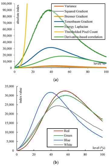 The optimum light conditions for the AF were determined at the maximum of the DFIs. Figure 5 shows that the curves of the DFIs usually form a single peak during focusing and lighting. Many DFIs showed maxima at the same focal position, although some DFIs presented different foci or had diverged. After determining the focus position, the light intensity was determined at the maximum values of the DFIs by increasing the light power. These focusing and lighting procedures were repeated for the other original colors. Figure 5a shows the variations of the DFIs according to the intensity of blue light. A threshold pixel became saturated, and a derivative-based correlation showed different focus positions; thus, these DFIs were excluded from determining the light conditions. The energy Laplacian and Tenenbaum gradient showed larger variations than that for the other DFIs. However, the energy Laplacian showed noise patterns and coarse curvature in the graph; the Tenenbaum gradient was finally selected for the AF. Figure 5b shows the responses of the Tenenbaum gradient according to the original color lights. From comparing the color responses of the Tenenbaum gradient, the highest maximum was formed when using the red color; thus, red light was selected for the AF. In addition, the color of the high-power laser was green (532 nm), i.e., a complementary color of the AF color; thus, the determined light color was advantageous for monitoring the laser ablation.