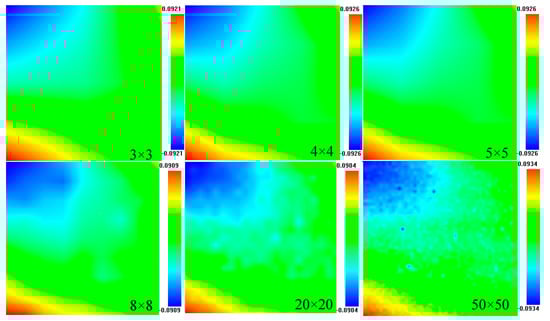 The variation in the grid density of the AF points and surface flatness values when using the ODS is shown as contour maps in Figure 6. A longer distance implies a farther distance from the CVC surface, and is lower on the CVS surface. Thus, the color in the contour maps changes from blue to red according to the −Δzd value. The red area indicates a local high surface with a long distance from the ODS, and the blue area indicates the inversion. The values of the indicators on the right of the contour maps show the minimum and maximum values of −Δzd. The contour maps show that the top-left of the CVC has lower values and the bottom-left has higher values. Additionally, the contour maps show that the top-right has slightly higher values and the bottom-right represents the average. The overall tendency of the contour maps in Figure 6 is similar to the variation of the grid density. However, the contour maps became coarse as the grid density increased. The contour map at a low grid density was smooth, but discontinuities such as dots and speckles increased at high grid density. The blue dots in the 50 × 50 map were caused by local cracks and porosity on the CVC. This indicates that a large number of sampling positions does not guarantee high-accuracy of surface flatness values. As shown in Figure 2, the concave curvature of the porosity is very small whereas the curvature of the CVC is very large. Thus, the blue dots should be excluded when approximating the surface flatness and positions of the ODS. The curvature of a thin film fixed on the CVC will have a smooth surface; thus, the effect of these local flaws on the surface flatness of the film decreases. In the contour maps, an 8 × 8 grid density was considered optimal when considering the smoothness, local variations, and focusing time.