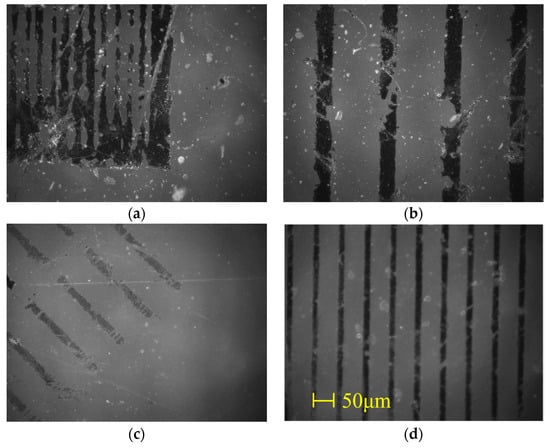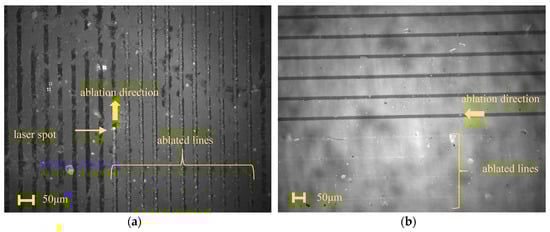 Figure 10 shows the laser ablation on the line patterns on the compensated position using alignment and surface flatness. Automatic alignment found positional deviation on XYθ directions and the deviation was applied to XY ablation position. Positions for laser ablation calculated using end edge of a pattern group, line pitch and line length. Z ablation positions were compensated using surface flatness according to XY machine coordinates. The left image shows that the ablation laser was focused with a 5 μm spot diameter and removed 10 μm-width line patterns on vertical direction. The right image shows laser ablation cleared line-patterns on horizontal direction using 7 μm spot diameter. Figure 10 shows that the micro lines printed on PET was removed after laser ablation.