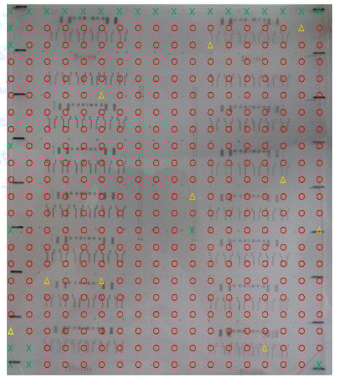 The distribution of the focus quality is mapped in Figure 9. O denotes focused, Δ denotes slightly defocused but ablatable, and X denotes completely defocused. The corresponding counts of points were 322, 10, and 28. Thus, 92.2% of the points in the ablation sample were available for laser ablation. However, 96.4% of the defocused points were placed at the edges of the ablation sample, and one point was located inside. This indicates that the chucking force using the vacuum is weak at the edges owing to leak; hence, the edge area floats relative to the inside and margin at the edge area is required when designing PE patterns. The defocused point inside was caused by large scratches on the CVC, which formed wrinkles in the film. These facts imply that scratches and bruises must be removed constructing the CVC for laser ablation of PEs.