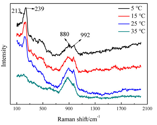 The Raman spectra of coatings prepared at different temperatures showed that the absorption around 213 and 239 cm−1 could be assigned to V2O3 [27] and peaks around 880 and 992 cm−1 to V2O5 [28] (Figure 3). All coatings, obtained at different temperatures, contained V2O5. With temperature increasing, the V2O3 absorption peak height gradually weakened, and at 35 °C, the peak significantly decreased, indicating that increased temperature did not stimulate V2O3 generation.