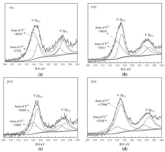 Examination of V-2p3/2 peaks in the coating produced under different temperatures showed that the core-level spectra could be fitted by two components with binding energies at ~515.3 and 571.6 eV, which were assigned to V2O3 and V2O5 [29], respectively (Figure 4). The peak area in the XPS spectra reflected the content of an element to some extent, such that the peak area can be used to compare the relative contents of different valence states of the same element. The peak areas of V3+ and V5+ components in coatings obtained at different temperatures were integrated, and was RVO used to represent the relative contents of V2O3 and V2O5 (RVO = V3+/V5+). The RVO results showed that, with the increasing temperature, RVO decreased from 2.93 at 5 °C to 0.30 at 35 °C, indicating that the V2O3 content decreased significantly, and at 35 °C, vanadium oxides mainly existed in the form of V2O5 (Table 6). These results are consistent with the results of Raman analysis.