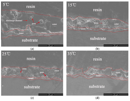 The examination of coating cross-sections showed that coating thickness gradually decreased with electrolyte temperature increase, and it is consistent with the coating thickness test results (Figure 6 and Table 5). There were discharge channels and discharge holes in coatings prepared at different temperatures. As temperature increased, the discharge channels and holes gradually increased and coatings became “loose.” Therefore, as electrolyte temperature rose, the coating interior density decreased.