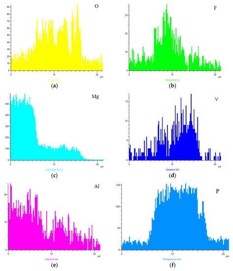 Element distributions of (a) O, (b) F, (c) Mg, (d) V, (e) Al and (f) P by line scanning along the arrow shown in Figure 7.