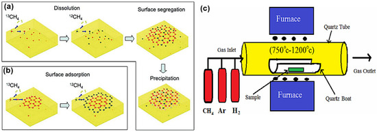 (a,b) Schematic demonstration of the growth mechanism of graphene. Reproduced with permission from [57]. Copyright 2009 American Chemical Society. (c) Schematic illustration of the CVD process setup. Reproduced with permission from [58]. Copyright 2015 CSIR-NISCAIR.