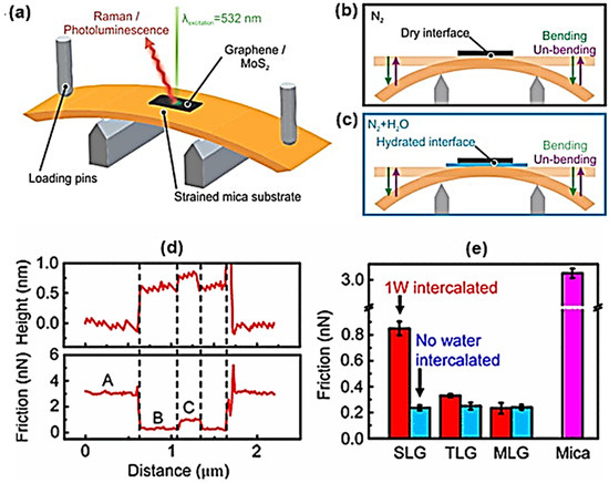 It has been proven that some low molecular weight vapors such as water under ambient conditions are needed for graphite to work as a solid lubricant. Several experimental results have shown that the vapors cast physisorbed molecular layers on the surface of the graphite and there is a noticeable increase in friction when the physisorbed layers evaporate [68,69]. Besides, fast water penetration via graphene capillaries within graphene oxide membranes has shown that there is low friction of water flow along graphene surfaces, suggesting that the sliding of graphene is lubricated by water. This result has also been supported by Computer simulations [70,71,72]. Lin et al. investigated the effect of interface hydration on the sliding of 2D materials (Figure 4). They proved that when the interfaces between a mica substrate and single-layers of graphene and MoS2 is hydrated with a molecularly thin layer of water, it usually affects the transfer of strain from the substrate to the 2D materials. The strain in graphene and MoS2 were detected by the changes in Raman and photoluminescence (PL) spectra, respectively. It was observed that the strain relaxation in graphene changes from stick-slip in dry contact, to viscous when hydrated. However, viscous relaxation was not seen in MoS2, despite hydration [73]. Moreover, the relaxation of graphene at the hydrated interface is slower when compared with the dry interface. This is probably due to the increase in the density of flexural phonons in graphene, which results in higher friction [74]. Lee and co-workers had already provided a clear picture of the elementary mechanisms for the dissipation of energy in friction and the role of intercalated molecular water films. They used graphene flakes deposited on mica substrate with intercalated water to demonstrate that the excitation of the vibration of atoms at the contact interfaces, where there is an increase in the availability of vibration modes improves friction. The transfer of energy from surface vibration to the bulk of the substrate are the two critical mechanisms responsible for energy dissipation in friction. They reported that the friction increased by a factor of ~3 in relation to the dry mica substrate. Besides, density functional theory (DFT) calculations revealed that water expanded the spectral range of graphene vibrations, especially the low-frequency flexural modes, thereby providing new excitation routes and also by widening the overlap with the atomic vibrations of the mica substrate, which promotes coupling and energy transfer [74]. Several other studies have shown that water can easily intercalate between graphene and hydrophilic substrates such as mica and silicon oxide [75,76,77,78].
