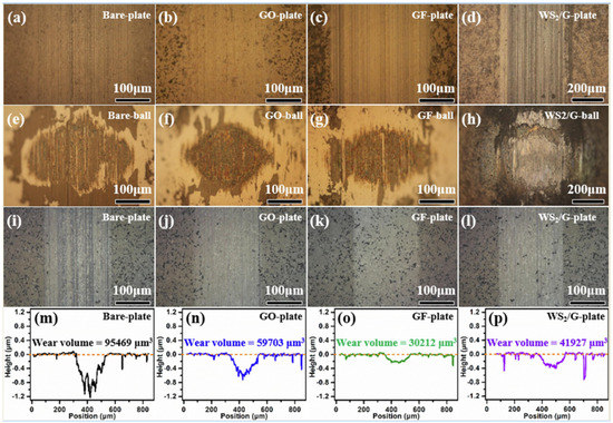The optical images showing: (a–d) The surface wear morphologies of the graphite plates and (e–h) the corresponding counter facing bearing steel balls after lubrication by the 2D lubricant additives for 12,000 cycles of frictional test, (i–l) the surface wear morphologies of the graphite after lubrication by the 2D lubricant additives before the complete evaporation of the alcohol, (m–p) the corresponding wear depths and wear volumes of the graphite. Reproduced with permission from [82]. Copyright 2020 Elsevier.