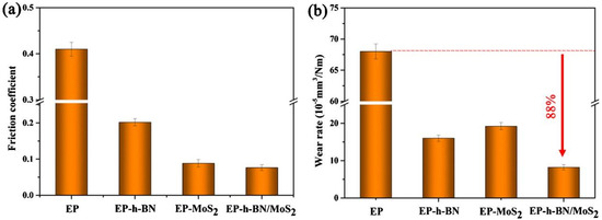 Chen et al. [102] investigated the tribological properties of epoxy coating reinforced with a novel hybrid of 2D h-BN/MoS2 (Figure 10). They observed that the COF and wear rate of the epoxy composite coating decreased by ~80% and ~88% as compared to pure epoxy. The composite coating still kept outstanding tribological properties under high load or sliding conditions. This is due to the excellent dispersibility of MoS2, high actions of h-BN and synergistic improving effect of h-BN/MoS2, including the deposition of transfer film on the sliding surface. Recently, Yu et al. [103] achieved a superlubricity state (COF 0.004 ± 0.001) by combining the synergistic effect of hydrogenated diamond-like carbon (H-DLC), MoS2 and hydrogen-free diamond-like carbon (DLC).