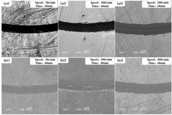 The morphologies of the wear tracks for pure MoS2 film (a1–a3) and the MoS2–WS2 composite film (b1–b3) after atomic oxygen irradiation at varying sliding speeds. Reproduced with permission from [111]. Copyright 2020 MDPI AG.