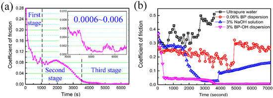 (a) Variation in the COF with time using the 7 wt.% BP-OH aqueous solution as the lubricant. The inset is the magnified graph of the COF after the running-in period. (b) The comparative plots of the COFs of four different lubricants including ultrapure water, 3% NaOH solution, 0.06% BP Dispersion and 3% BP-OH dispersion. Reproduced with permission from [119]. Copyright 2018 American Chemical Society.