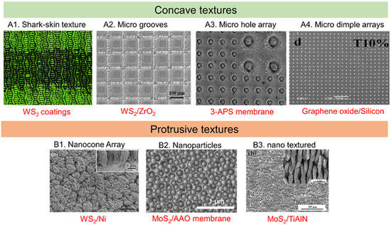 Different types of micro/nano textured surface used with 2D materials for reducing friction coefficients and wear. (A1) Shark-skin texture [132]; (A2) Linear micro grooves with WS2 coatings [133]; (A3) Micro hole array with 3-APS membranes [134]; (A4) Micro dimple arrays of silicon with graphene oxide film on top [135]; (B1) Nanocone array of nickel with WS2 film [136]; (B2) Nanoparticles embedded in AAO membranes with MoS2 films [137]; (B3) Nano textured TiAlN with MoS2 coating [138].