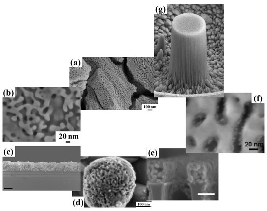 Thanks to these characteristics, NPG-based sensors are finding applications in medical, biological and safety fields so as in medical diagnostics and monitoring processes. So, a rapidly growing literature is currently investigating the properties of NPG systems toward the detection of a multitude of classes of analytes highlighting strengths and limits. In this sense, Table 1 reports a short and exemplificative list of the specific NPG-based systems with the corresponding application and reference. This literature shows the growing importance of NPG-based sensing and the importance to design NPG-based structures with a more complex morphology than standard bulk leafs (Figure 1a,b) and films (Figure 1c) as NPG nanoparticles (Figure 1d), NPG nanowires (Figure 1e), NPG leafs decorated by nanoparticles (Pt nanoparticles in Figure 1f), and NPG patterned microstructures (column in Figure 1g) so as to obtain structured-designed materials with improved performances.