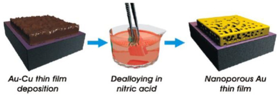 Schematic picture of the free-corrosion dealloying process of Au-Cu alloy film for the production of NPG film. Reproduced with permission from [39]. Copyright American Chemical Society, 2015.