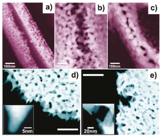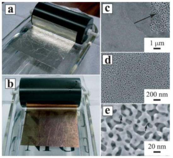 (a) shows an optical image of a Ag-Au 12 carat leaf, 1:1 ratio by weight, and (b) reports the optical image of the same leaf after dealloying in concentrated HNO3 for 15 min; (c–e) report scanning electron microscopy images of the surface of the dealloyed leaf with increasing magnification from (c–e). The typical nanoporous structure is clearly observable as composed by Au ligaments (with width until 2 nm) and pores; the inset in (c) shows a region on the sample surface where a grain boundary is located. Reproduced with permission from [24]. Copyright Wiley, 2004.