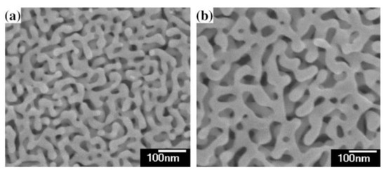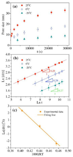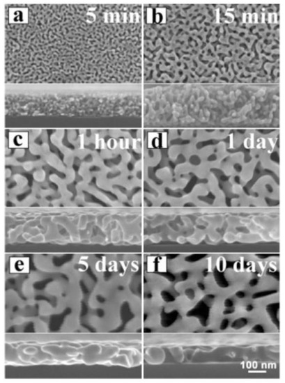 In particular, from a quantitative point of view, Qian et al. [32] studied the kinetics of the pore formation by dealloying in NPG leafs. Their results are summarized in Figure 6: they used Ag65Au35 (atomic ratio) leafs and produced, on the leaf’s surface, NPG films by dealloying the leafs in 70% (mass ratio) HNO3 for various times and temperatures (−25 °C, 0, 25 °C).