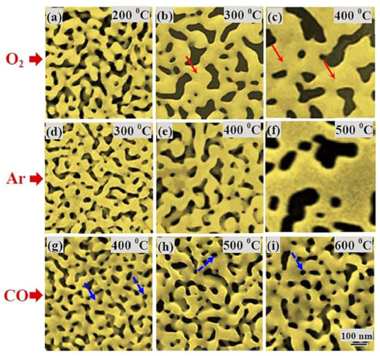 Scanning electron microscopy images of NPG film thermally processed for two hours under different atmospheres: (a–c) at 200, 300, 400 °C in O2, (d–f) at 300, 400, 500 °C in Ar, (g–i) 400, 500, 600 °C in CO. Reproduced with permission from [33]. Copyright Elsevier, 2015.