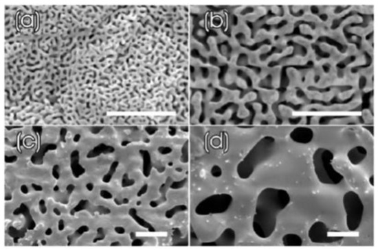 Representative scanning electron microscopy of the surface of NPG: (a) as obtained by the dealloying process, (b) after dealloying and annealing at 300 °C for 120 min, (c) after dealloying and annealing at 450 °C for 120 min, (d) after dealloying and annealing at 550 °C for 120 min. Scale bars: 1 μm. Reproduced with permission from [53]. Copyright American Physical Society, 2006.