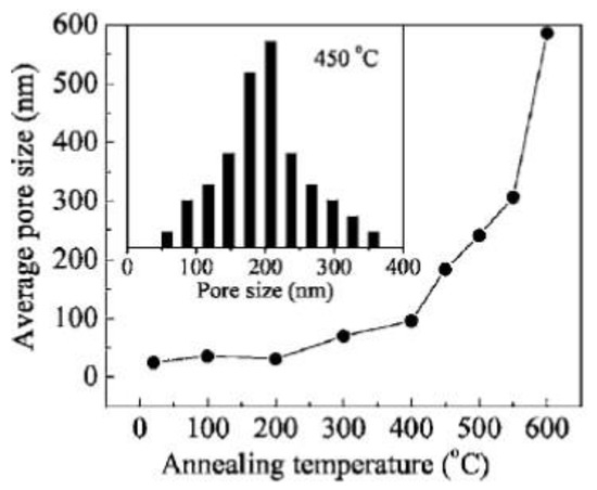 Evolution of the mean pores size in NPG annealed for two hours from 100 °C to 600 °C in Ar. The inset reports the distribution of the pores sizes after annealing at 450 °C. Reproduced with permission from [53]. Copyright American Physical Society, 2006.