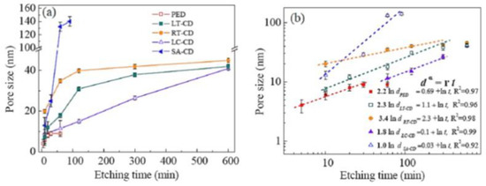 As a first example, Chen et al. [54] studied the pore-size tuning and optical properties of NPG films. They fabricated 100 nm-thick NPG films using pulse electrochemical dealloying and chemical dealloying with averge pore size ranging from 4 nm to 140 nm by controlling the dissolution rate of Ag atoms and surface diffusion rate of Au atoms along the alloy-solution interfaces. In particular, Figure 13 reports, according to the authors, the plot (both in linear scales (a) and in Log-Log scale (b)) of the evolution of the mean pores size versus the etching time for samples produced by various dealloying approaches (electrochemical dealloying, PED, low-temperature chemical dealloying, LT-CD, room-temperature chemical dealloying, RT-CD, low-concentration of electrolyte chemical dealloying, LC-CD, surface-assisted chemical dealloying, SA-CD).