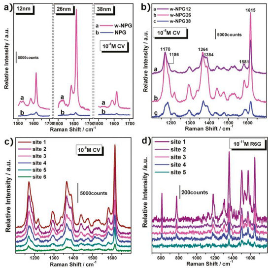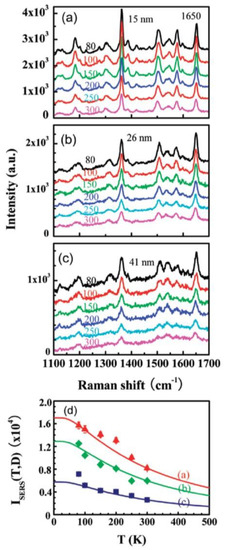 So, Figure 16 reports, as examples, SERS spectra for the NPG films with pores size of 15 nm (a), 26 nm (b), 41 nm(c) acquired changing the sample temperature from 80 K to 300 K, and showing that the SERS enhancement increases by decreasing the temperature, as summarized in Figure 16d where the intensity of the Raman peak at 1650 cm−1 is plotted, for the three samples, versus the sample temperature.