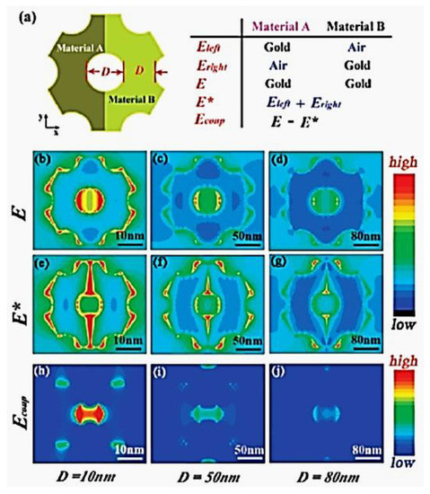 (a) Representation of the nanostructure geometry emplyed for discrete dipole approximation-based (DDA) simulations. Calculated total electric field (E) (b–d), localized electric field (E*) (e–g), and electromagnetic coupling electric field (Ecoup) distributions (h–j) on the top surface of the NPG with D = 10, 50, and 80 nm, respectively. Reproduced with permission from [55]. Copyright American Chemical Society, 2009.