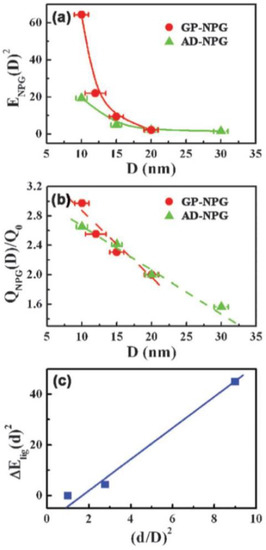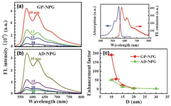 being Q0 = Γ0/(knr + Γ0) and Γ0 the intrinsic radiative decay rates of fluorophores. As a consequence, in view of this modeling, Figure 19 shows in (a) that the local field enhancements of Au-plated NPG films, increases by the factors of about 2.2 to about 64 as D decreases from about 20 nm to about 10 nm and as d increases from about 20 nm to about 30 nm, and these local field enhancements are larger than those obtained for the as-dealloyed NPG films.