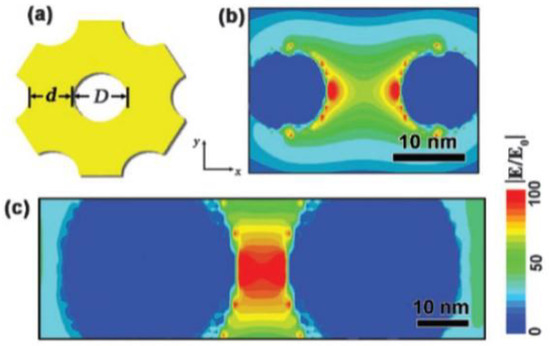 (a) Geometry of the nanostructure (pore of size D and ligament of size d) used for the discrete dipole approximation calculation. (b) Result of the calculation for the electric field distribution (|E/E0|) in the vicinity of the Au ligament in the case of the as-dealloyed NPG (AD-NPG) sample characterized by D = 10 nm and d = 10 nm. (c) Result of the calculation for the electric field distribution (|E/E0|) in the vicinity of the Au ligament in the case of the Au-plated NPG (GP-NPG) sample characterized by D = 10 nm and d = 30 nm. The calculations are performed considering an incident light of 514 nm polarized in the x direction. Reproduced with permission from [56]. Copyright Royal Society of Chemistry, 2011.