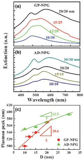(a) UV-Visible extinction spectra of Au-plated NPG films (GP-NPG), coated with a HSA monolayer, and with D = 10 nm and d = 30 nm, D = 12 nm and d = 28 nm, D = 15 nm and d = 25 nm, D = 20 nm and d = 20 nm. (b) UV-Visible extinction spectra of as-dealloyed NPG films (AD-NPG), coated with a HSA monolayer, and with D = 10 nm and d = 10 nm, D = 15 nm and d = 15 nm, D = 20 nm and d = 20 nm, D = 30 nm and d = 30 nm. (c) Wavelength of the plasmon resonance peaks of HSA/GP-NPG and AD-NPG films versus the pore size D. Reproduced with permission from [56]. Copyright Royal Society of Chemistry, 2011.